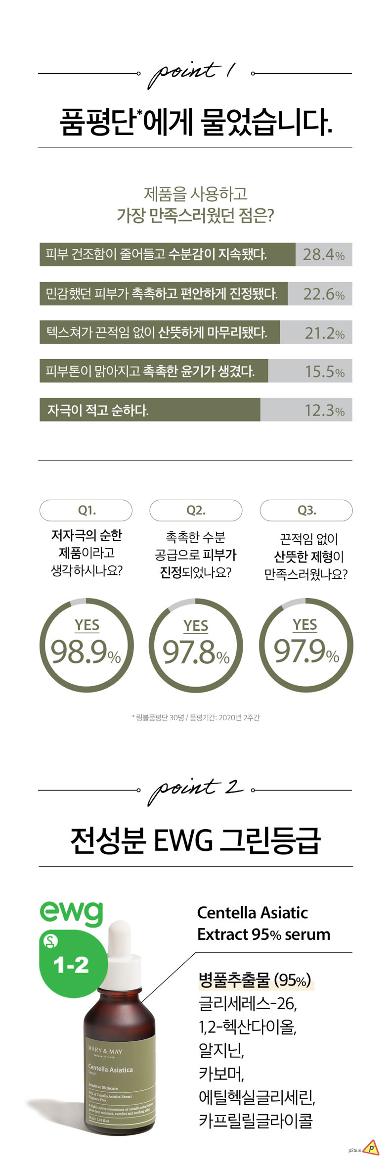 配方含有95%的國內產積雪草提取物,最大程度的發揮有效成分的功效,僅以最佳比例混合必需的7種有效成分,帶給肌膚柔嫩舒適感。積雪草提取物的亞細亞酸和積雪草皂苷成分含有防止細胞因B-amyloid導致死亡的成分及抗細菌成分,有助於恢復傷口,羥基積雪草甙則有助於皮膚再生和增強彈性。複合物能夠強化肌膚防禦力,有效舒緩肌膚,減少乾燥泛紅不適,提升肌膚修復力。